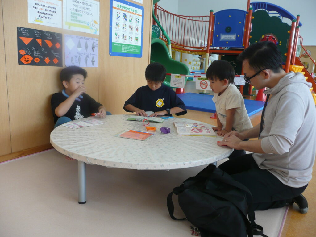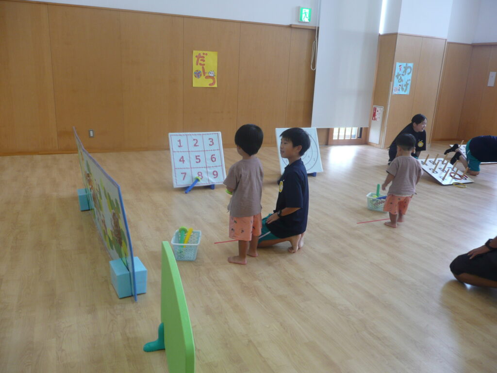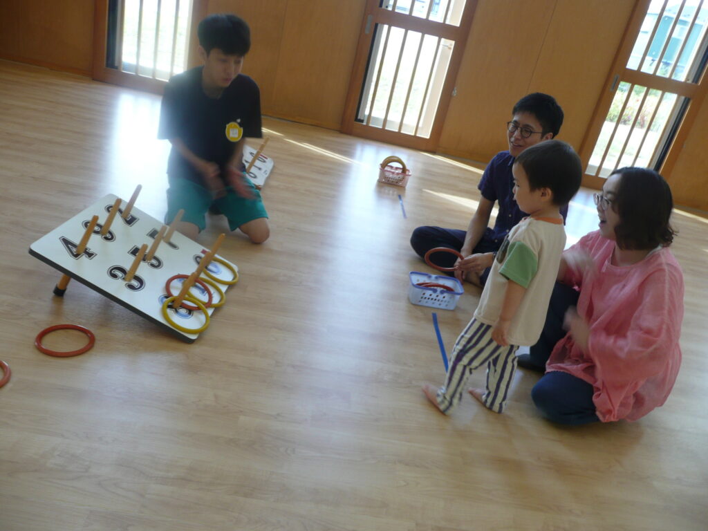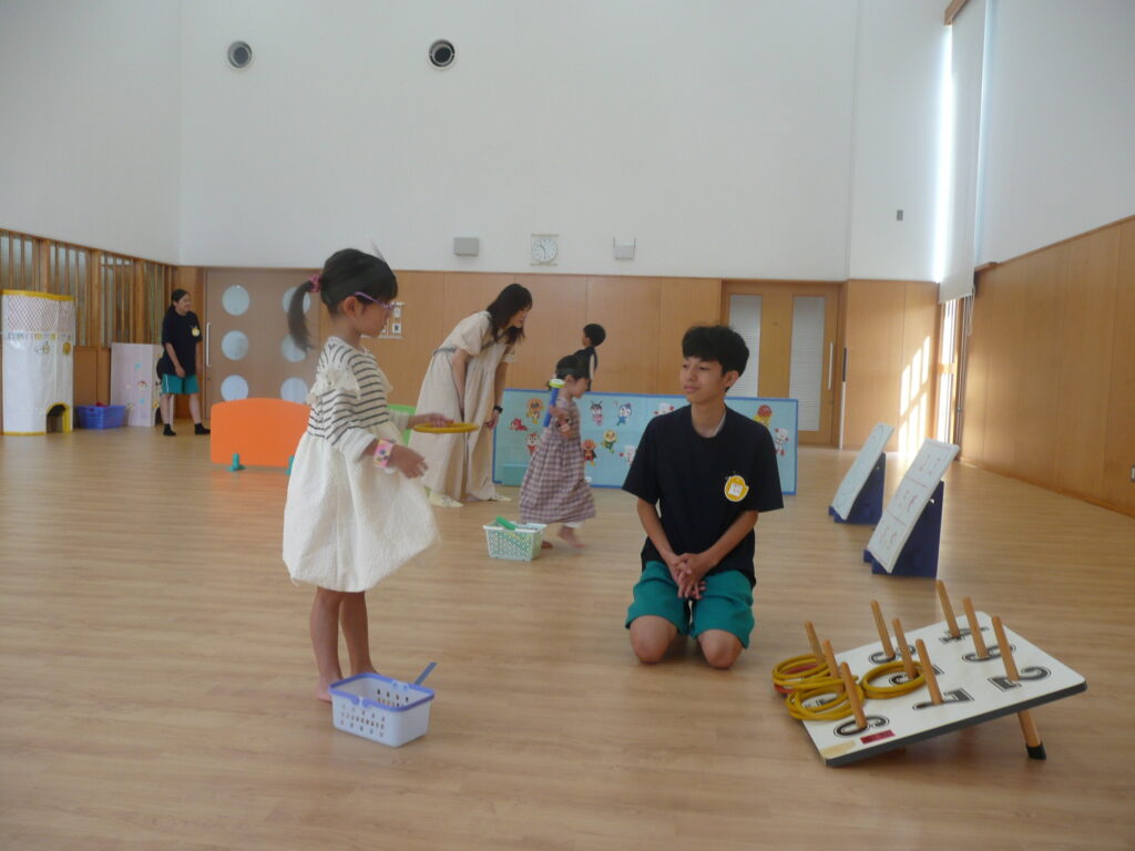 9月27日(土)、三川町中高生ボランティアサークル「来夢来人」の3名が訪問してくれました。支援センターでは、おまつりごっこをしました。お面づくりとブレスレットづくりの製作活動、ワ二ワ二パニック、ソフトダーツ、輪投げの見守りをしてもらいました。お兄さんお姉さんたちに「すごい!上手い!」と言われると子どもたちはとても嬉しそうでした。折り紙が得意なお兄さんは、子どもたちと一緒に折り紙を折っていました。頼もしい来夢来人のお兄さんお姉さん、ありがとうございました!