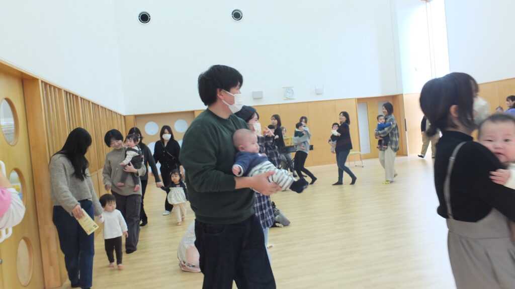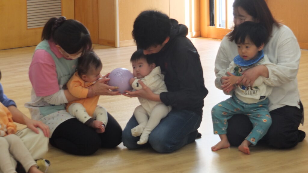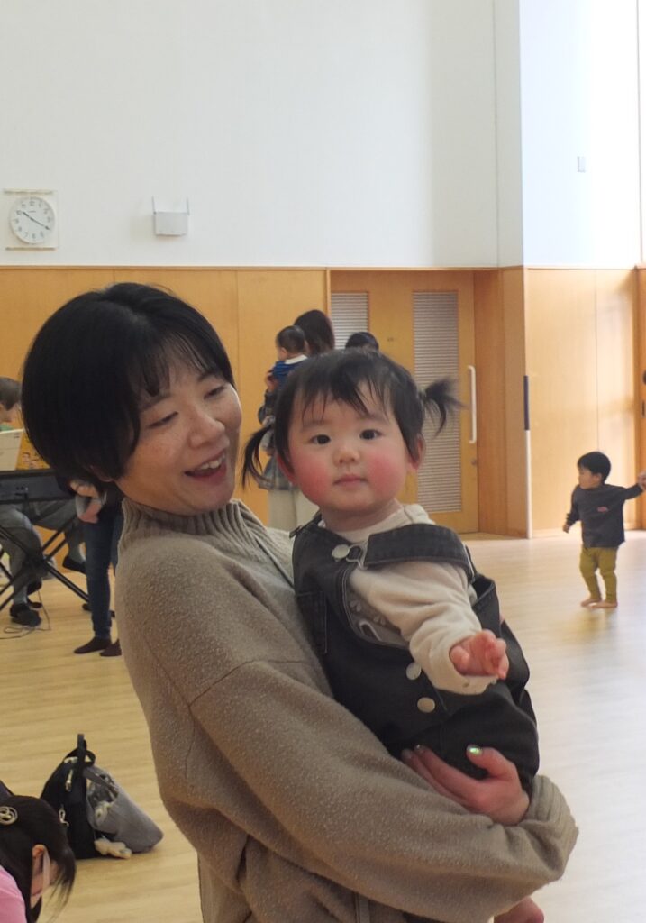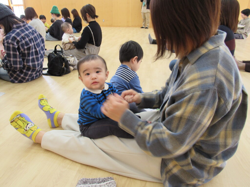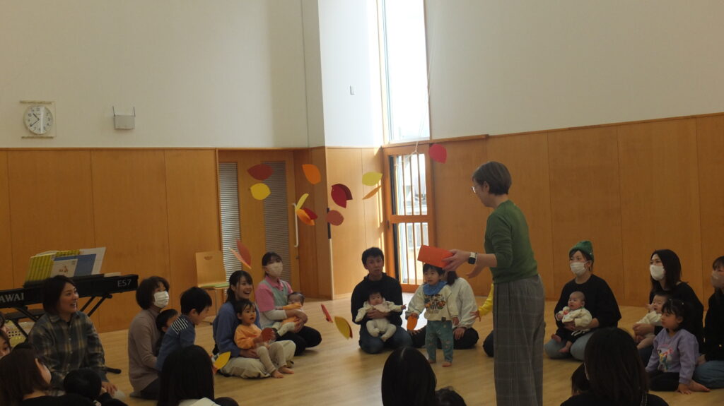 今日は、0歳から5歳までの18組の親子が参加してくださいました。まずは、ピアノの音色に合わせて親子でお散歩♪おうちの人と触れ合いながらのお散歩はリラックスできてとても良かったですね。ピアノに合わせたボール渡しでは、落とさないように気を付けながら優しくゆっくりと隣のお友だちにボールを渡しました。次は、果物の形をしたマラカスを選んで、音楽に合わせてフリフリ♪ 先生から秋の葉っぱのプレゼントをもらい、ひらひら落ちる様子を楽しんだり、どんぐりのシールを貼ったりして季節を感じながらリトミックを楽しみました。最後は、先生のピアノを聴きながら絵本「くだもの」を見ました。だんだん音色が変わっていき、みんな引きこまれていました。子どもたちは知っている果物の名前を言いながらパクっと食べる真似をして盛り上がっていました!先生、素敵なリトミックの時間をありがとうございました!