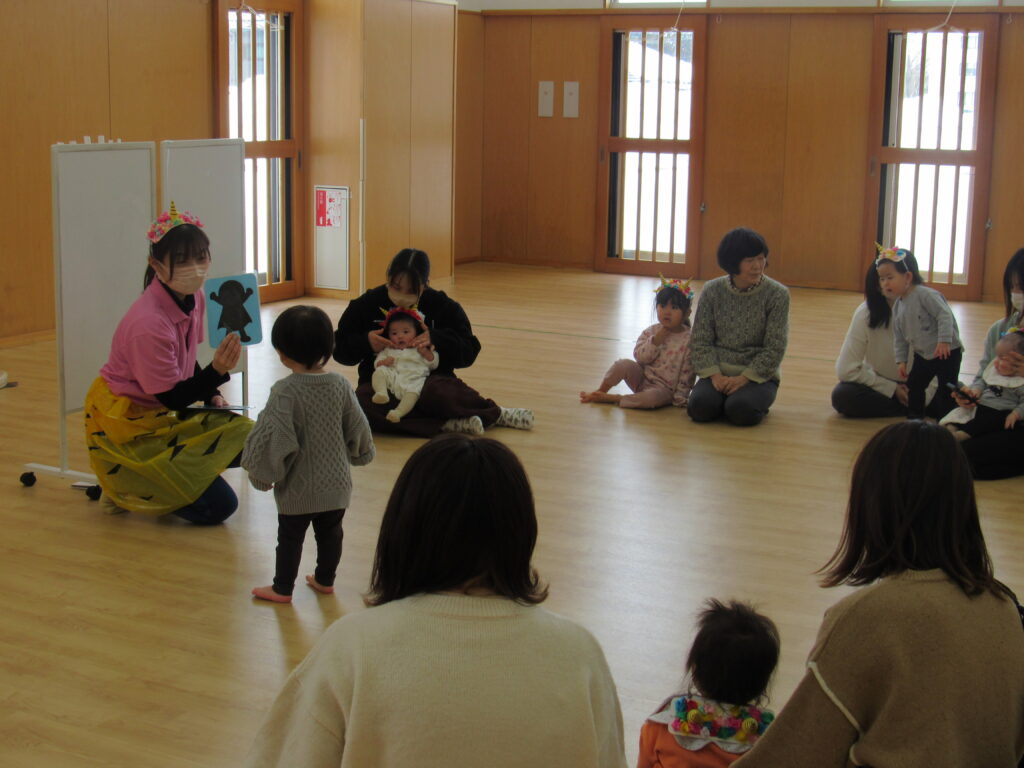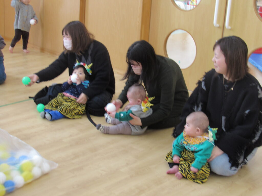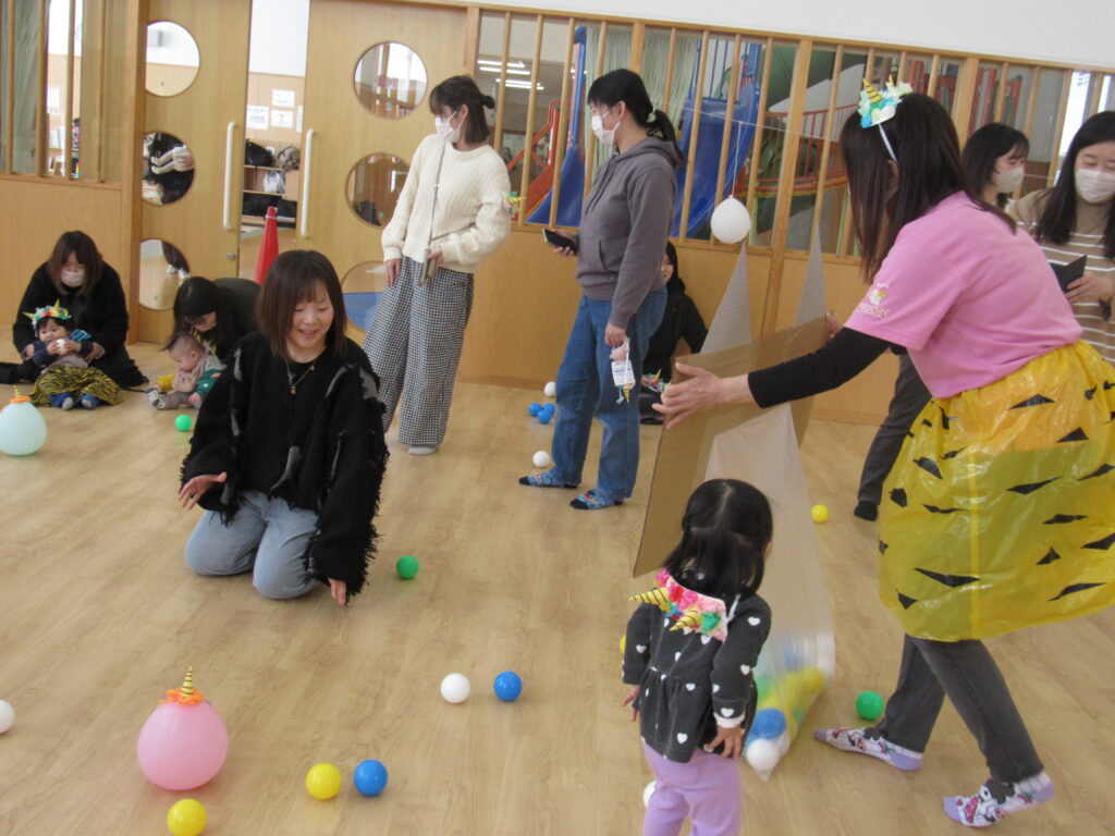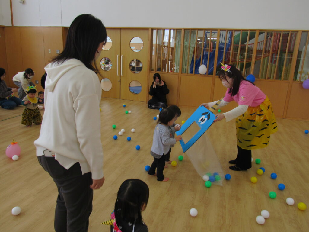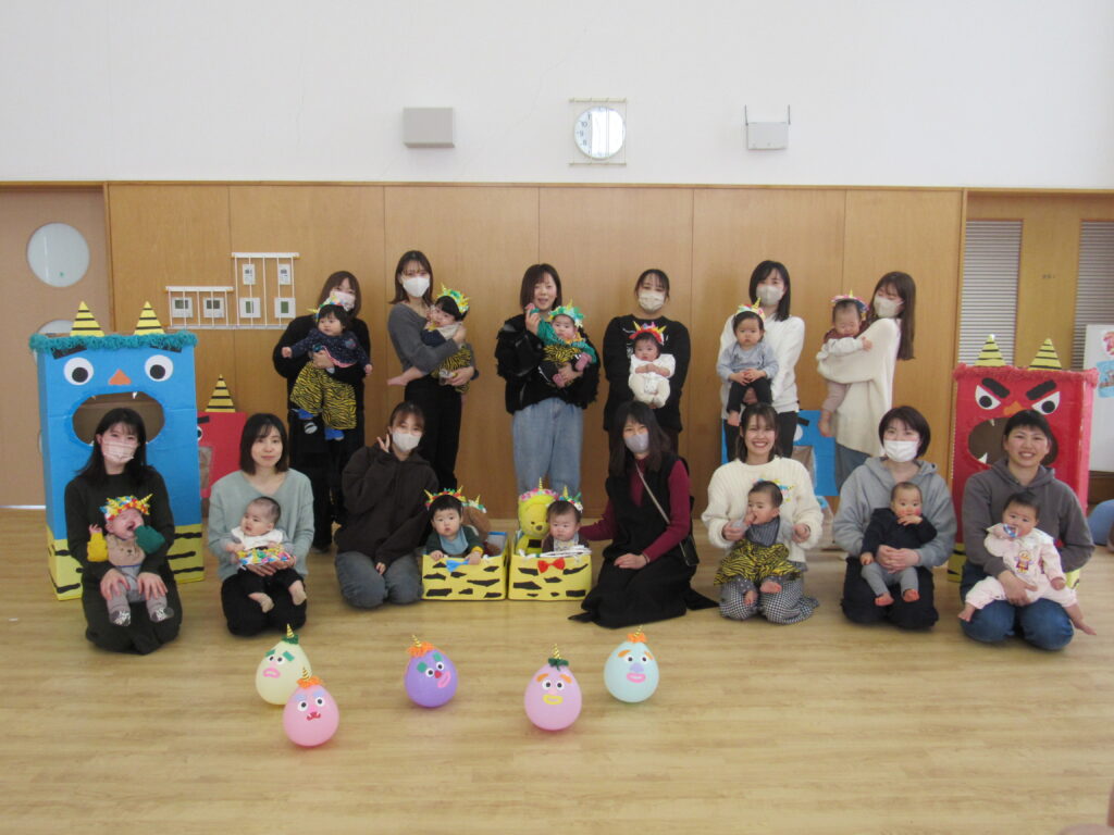 2日(月)は、節分の製作をしました。色とりどりのフラワーペーパーをくしゃくしゃっと丸めて自分だけのヘアバンドを作りました。作った後は、ヘアバンドをつけて、豆まき遊びがスタート!みんなで「鬼のパンツ」を踊って準備万端!鬼のパンツ号に乗って鬼退治に出発しました。赤ちゃんは、風船鬼を倒したり、大きいお友だちは、マットを登ったり、風船鬼を倒したり、いろいろな鬼さんに立ち向かっていました(^_-)-☆最後は、みんなで豆まきをしました。赤鬼さんと青鬼さんにたくさんボールを投げましたね♪とても盛り上がり、楽しく会が終わりました。遊びに来てくれた皆さん、ありがとうございました。明日3日(火)も節分の製作ができます!ぜひお越しください。