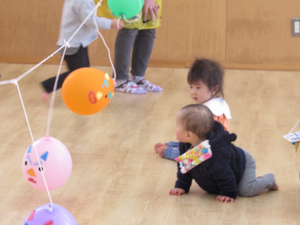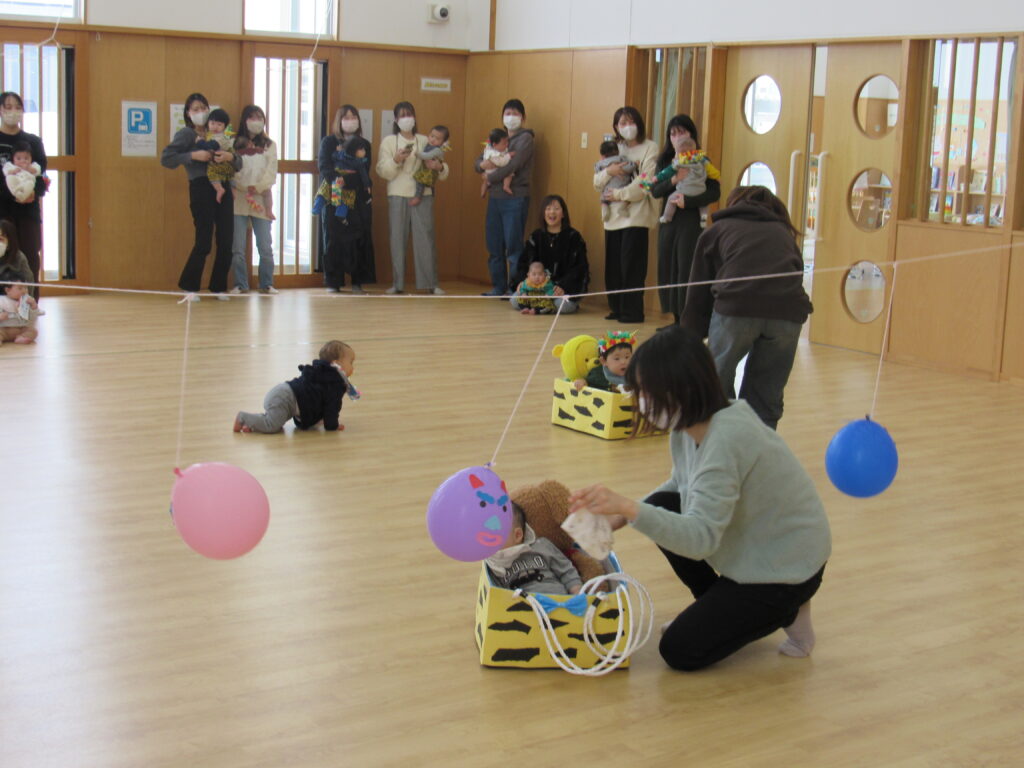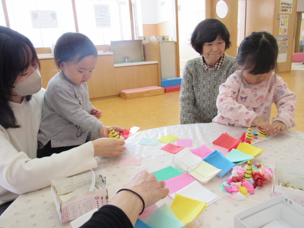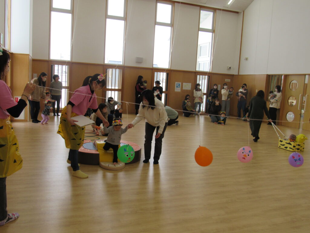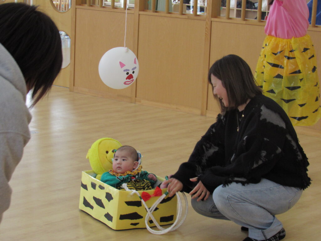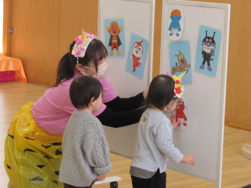 2日(月)は、節分の製作をしました。色とりどりのフラワーペーパーをくしゃくしゃっと丸めて自分だけのヘアバンドを作りました。作った後は、ヘアバンドをつけて、豆まき遊びがスタート!みんなで「鬼のパンツ」を踊って準備万端!鬼のパンツ号に乗って鬼退治に出発しました。赤ちゃんは、風船鬼を倒したり、大きいお友だちは、マットを登ったり、風船鬼を倒したり、いろいろな鬼さんに立ち向かっていました(^_-)-☆最後は、みんなで豆まきをしました。赤鬼さんと青鬼さんにたくさんボールを投げましたね♪とても盛り上がり、楽しく会が終わりました。遊びに来てくれた皆さん、ありがとうございました。明日3日(火)も節分の製作ができます!ぜひお越しください。