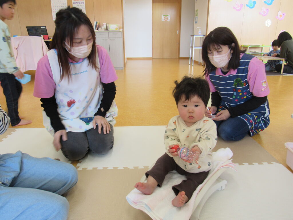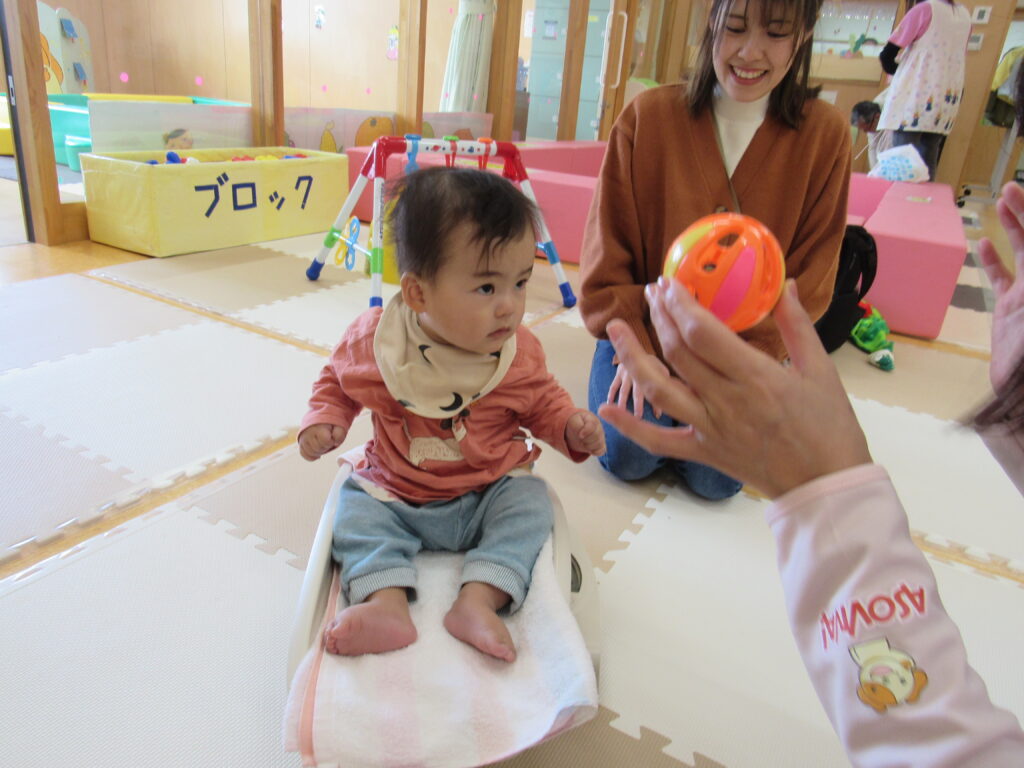 今日は、身体測定の日でした。前回より、大きくなった子どもたち♪「家ではなかなか測れないので助かります~」というママの嬉しいお言葉もありました。お座りができるようになったり、よく笑うようになったりと、日々の成長を感じられる貴重なひとときでした。