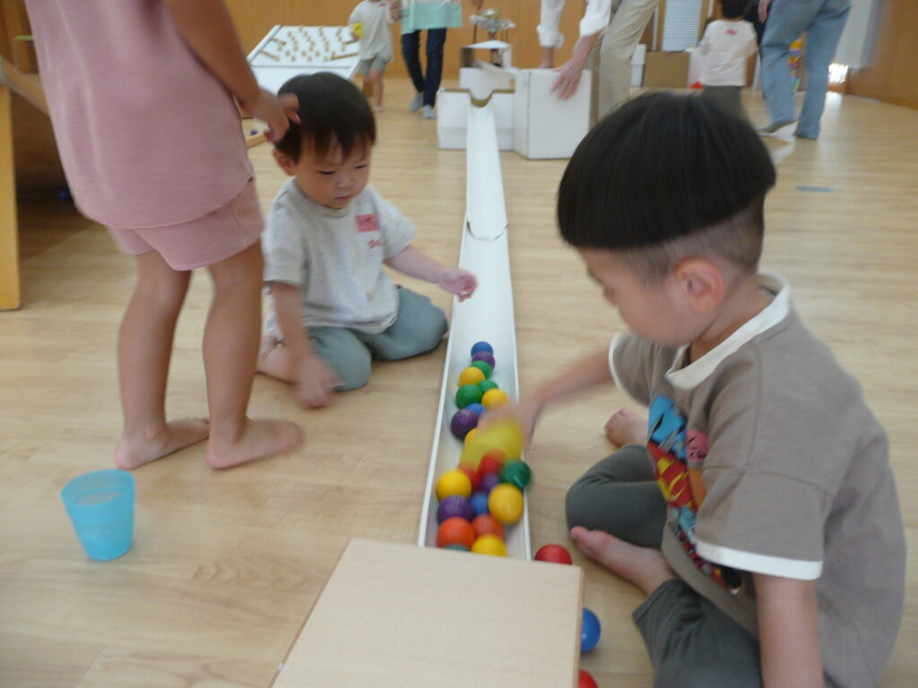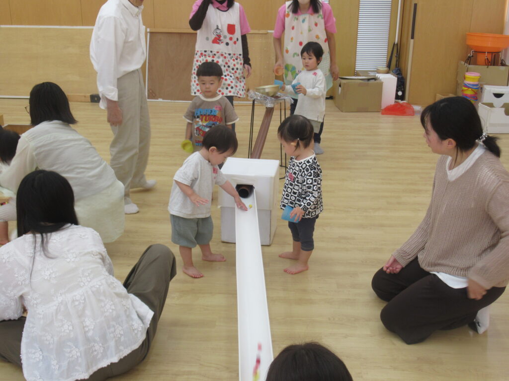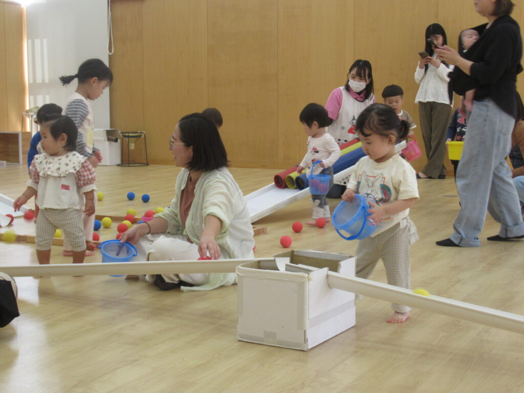 そのあとは、色んな大きさのボールを使った遊びがスタート!!大きくて柔らかいボールから、小さくて硬いボールの転がりにみんな興味津々♪