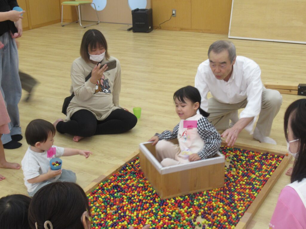 箱の中に入ってボールの上をすいすいっ!不思議な感覚を味わったり、ボールを追いかけて行ったり、仕掛けはなんだろうと目が離せませんでした。手作り玩具の世界はいつも人気です♪ ありがとうございました♬