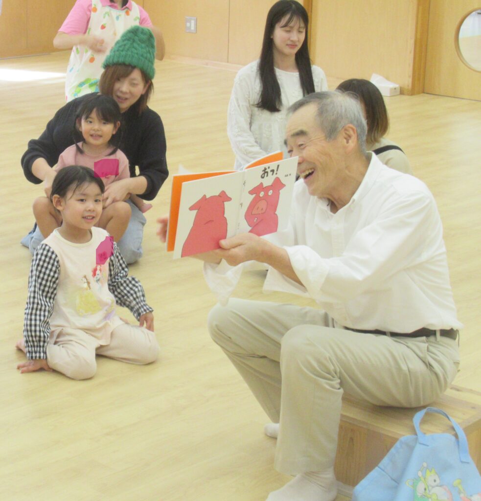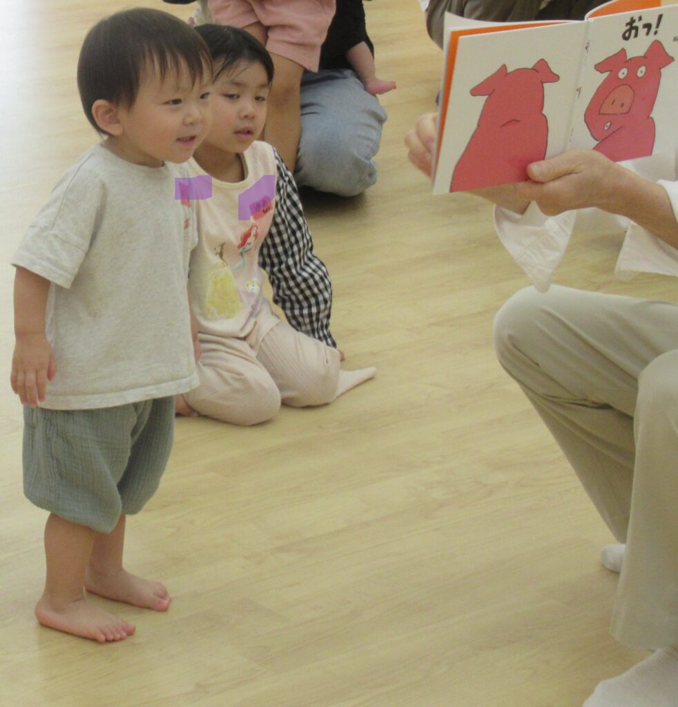 はじめに大型絵本「ころころころ」の読み聞かせをしていただき、勘太郎文庫さんの工夫が凝らされた抑揚のある読み聞かせに子どもも大人も早速心をつかまれました♬